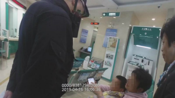 图说:民警在银行对余女士进行劝说。徐汇警方供图